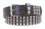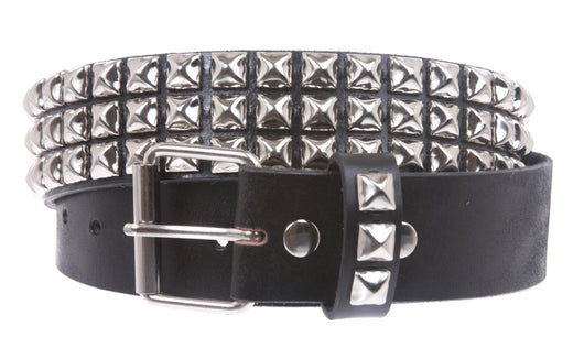 - This classic silver pyramids punk rock studs belt is made of 100% leather for durability and long lasting; This belt features the most popular three rows of silver color punk rock star metal studded hardware and also removable roller buckle with snap on feature which allows you to switch most buckles.