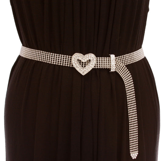 - Stylish rhinestone encrusted heart buckle, keeper and tip; Perforated heart shape center; Mesh metal waistband, great look for wedding and all occasions!