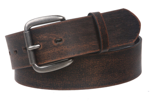 *Perfectly vintage belt to rock with anything and everything *Distressed hand-finished 100% genuine leather. *Single prong interchangeable roller buckle in brushed silver finish *Width: 1 3/4" - 45 mm *Available colors: black, brown *Size Chart: |30" (from buckle prong to center hole);|End to end: 36" |34" (from buckle prong to center hole);|End to end: 40" |36" (from buckle prong to center hole);|End to end: 42" |38" (from buckle prong to center hole);|End to end: 44" |42" (from buckle prong to center hole);|End to end: 48" |45" (from buckle prong to center hole);|End to end: 51" Notes: This is unisex belt. There are total of five holes, 1" apart. It is recommended to select size from buckle fold to center hole that better matches measurement of your waist or where you wear this belt. It would be more comfortable to measure where you will wear the belt, add 1-2", and then pick the size where this number falls.