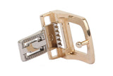 - Gold and silver, two tones color finish clamp buckle - clamp on, interchangeable buckle ; Additional buckle of the same style or other similar 1 1/8 inch clamp on buckles are available to shop at our online site