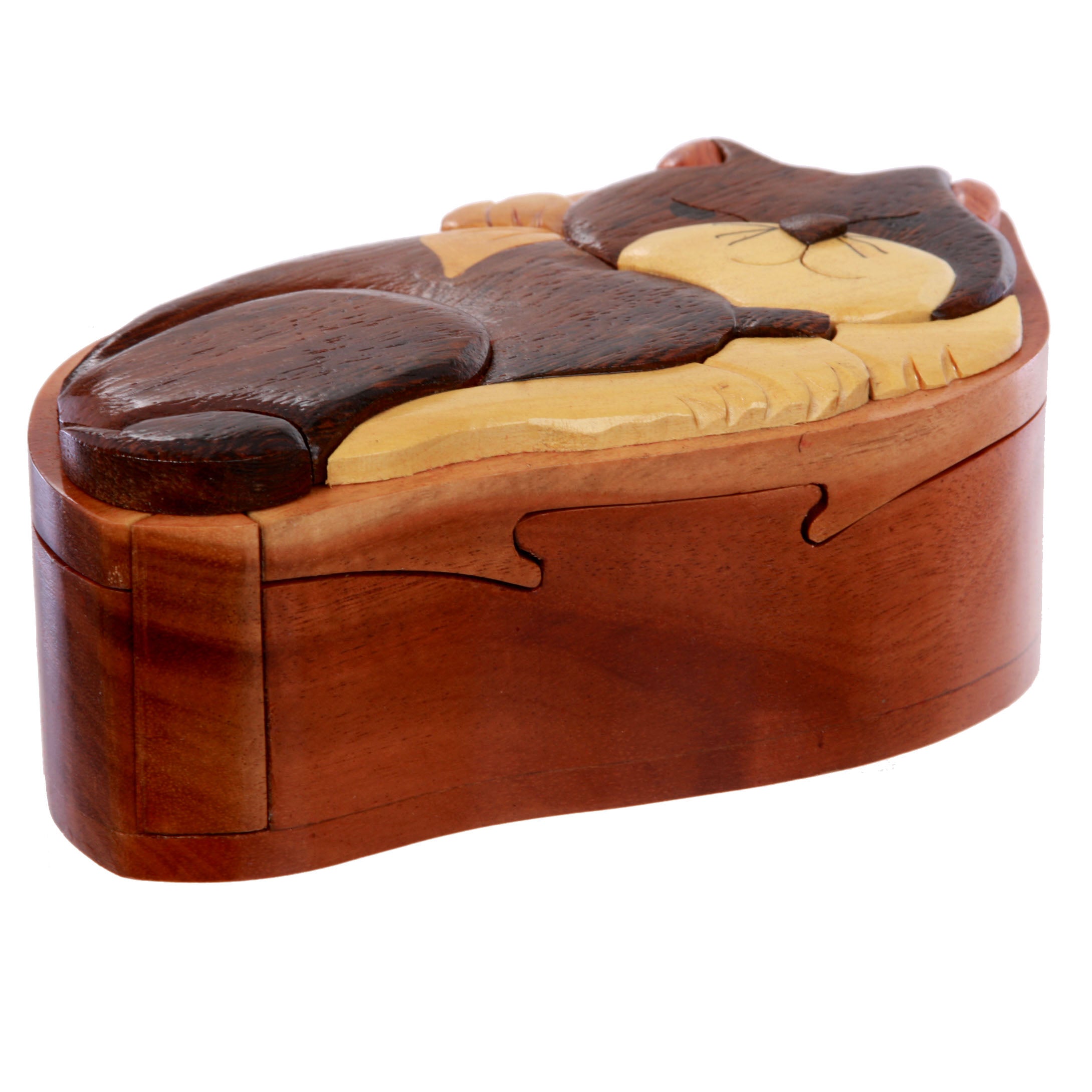 Handcrafted Wooden Rectangular Sleeping Kitty Secret Jewelry Puzzle Box - Sleeping Cat