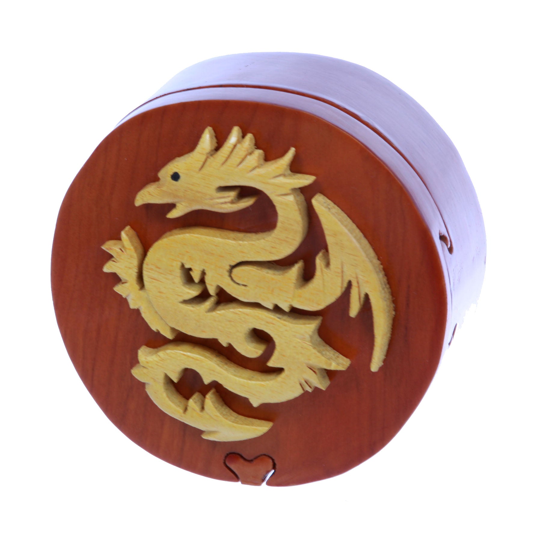 Handcrafted Wooden Round Dragon Shape Secret Jewelry Puzzle Box - Dragon