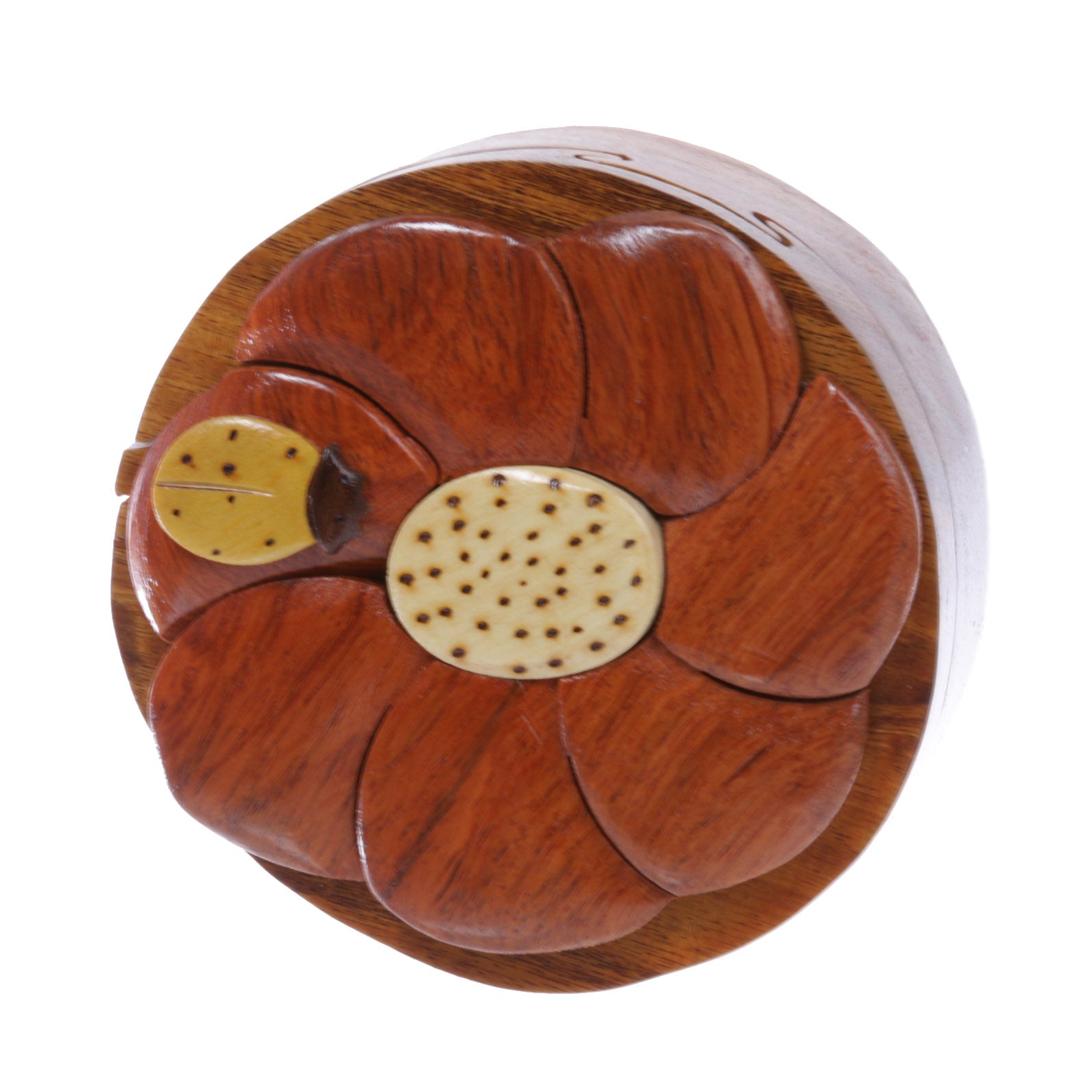 Handcrafted Wooden Beatle & Flower Round Shape Secret Jewelry Puzzle Box - Beatle & Flower