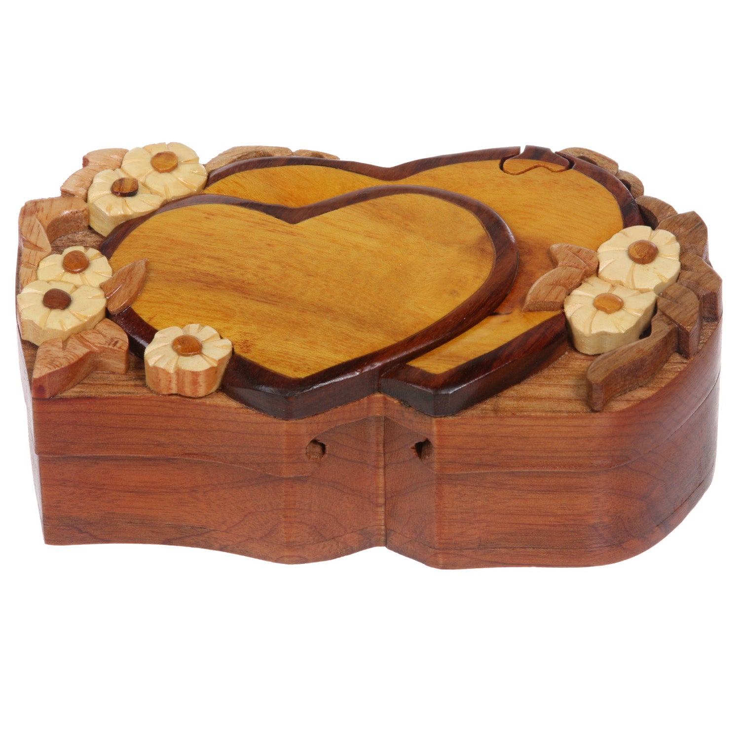 Handcrafted Wooden Double Heart Shape Secret Jewelry Puzzle Box