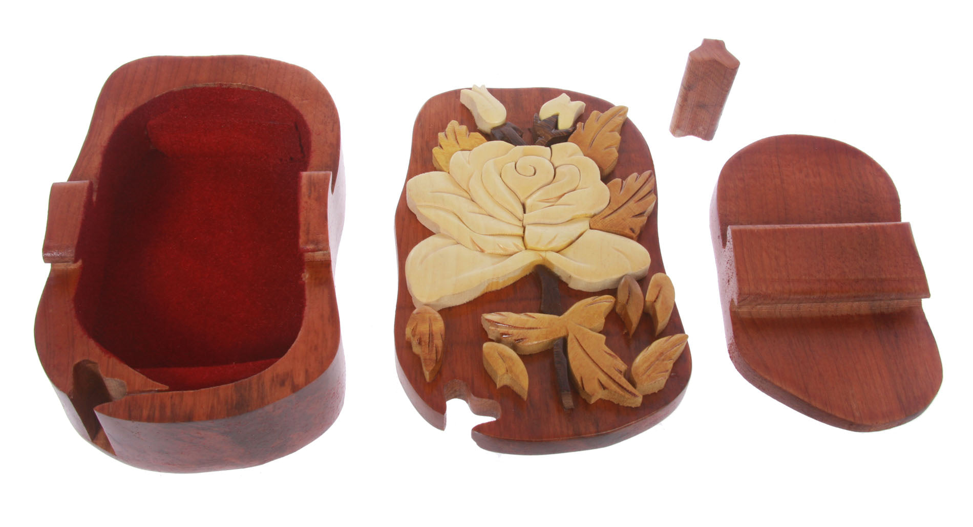 *This Handcrafted Wooden Rose Flower Shape Secret Jewelry Puzzle Box - Rose Flower shaped Secret jewelry box can only be opened if you know the secret. Perfect gift for that special someone. Beautifully Hand Made Wooden Box with Hand-carved embossed Handcrafted Wooden Rose Flower Shape Secret Jewelry Puzzle Box -Rose Flower on the lid. It has a secret locking device, although the big secret opening isn't all that difficult to figure out. It is brand new. Each individual box is unique, they may look different from each other since every part of the box is made of unique wood material *Every piece comes in the original manufacturer's packaging. The photos here show an example of the item for sale. The coloring, grain and stripes might be different piece to piece, due to their uniqueness *Exterior Dimension (L X W X D): 5 1/4"(13cm) X 3 1/4"(8cm) X 2"(5cm) *Interior Dimension (L X W X D): 3 5/8"(9cm) X 2 1/2"(6.5cm) X 3/4"(1.9cm) *It is simple, well made, and useful for jewelry, money, or anything small in size you want storage for. *You will get a lot of compliments on it