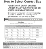 - Sizing: belt size is measured from where the leather ends at the buckle end to the center hole at the tip end, order 1 or 2 inches larger than pants size or where you will wear this belt.