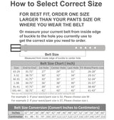 - Sizing: This belt is measured from inside edge of buckle to the center hole, the 3rd hole from the tip end. order 2 inches larger than pants size for best fit. e.g.: S 30"-32" fits pants size 28"-30"; M 33"~35" fits pants size 31"-33"; L 36-38" fits pants size 34"-36"; XL 39"-41" fits pants size 37"-39"