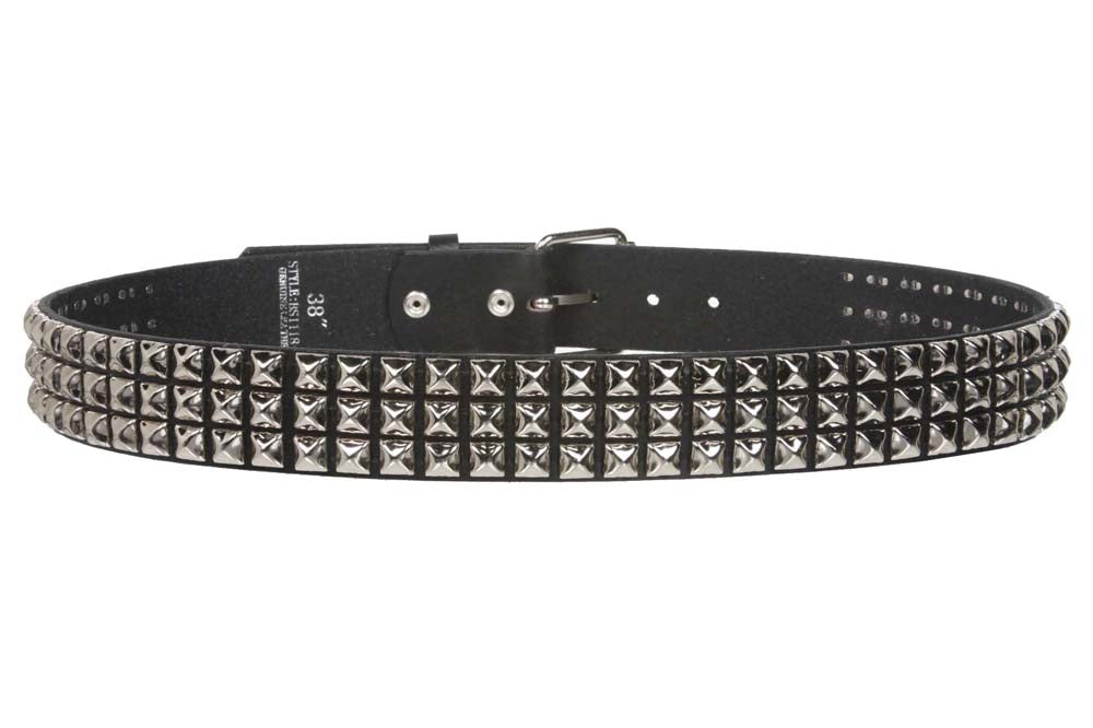• This classic silver pyramids punk rock studs belt is made of 100% cowhide leather for durability and long lasting; This belt features the most popular three rows of silver color punk rock star metal studded hardware and also removable roller buckle with snap on feature which allows you to switch most buckles.