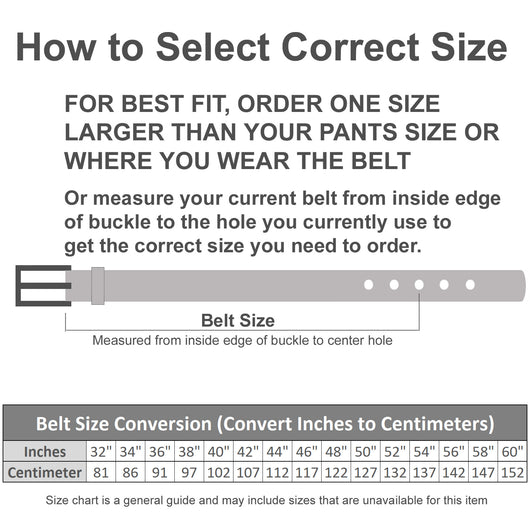 - Sizing: belt size is measured from inside edge buckle to center hole at tip end, order 2 inches larger than pants size for best fit, e.g. 32" pants order Size 34" belt
