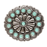 - Western vintage silver oval buckle features an intricate floral with turquoise stones detailing