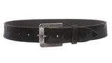 *This genuine full grain leather belt, oil-tanned, soft hand feeling, vintage, distressed looking, features snap on removable buckle, optional for you to switch any of your favorite buckles. *Material: 100% cowhide full grain oil-tanned soft leather, *Width of belt: 1 1/2" (38 mm) *Size Chart: |Size: 32" from buckle fold to center Hole;|End to end: 37 1/2" |Size: 34" from buckle fold to center Hole;|End to end: 39 1/2" |Size: 36" from buckle fold to center Hole;|End to end: 41 1/2" Notes: the size chart does not include buckle length. There are total of five holes, 1" apart. It is recommended to select size from buckle fold to center hole that better matches measurement of your waist or where you wear this belt. It would be more comfortable to select a size that is about 1" or 2" bigger than the actual measurement of your waist or where you wear this belt.