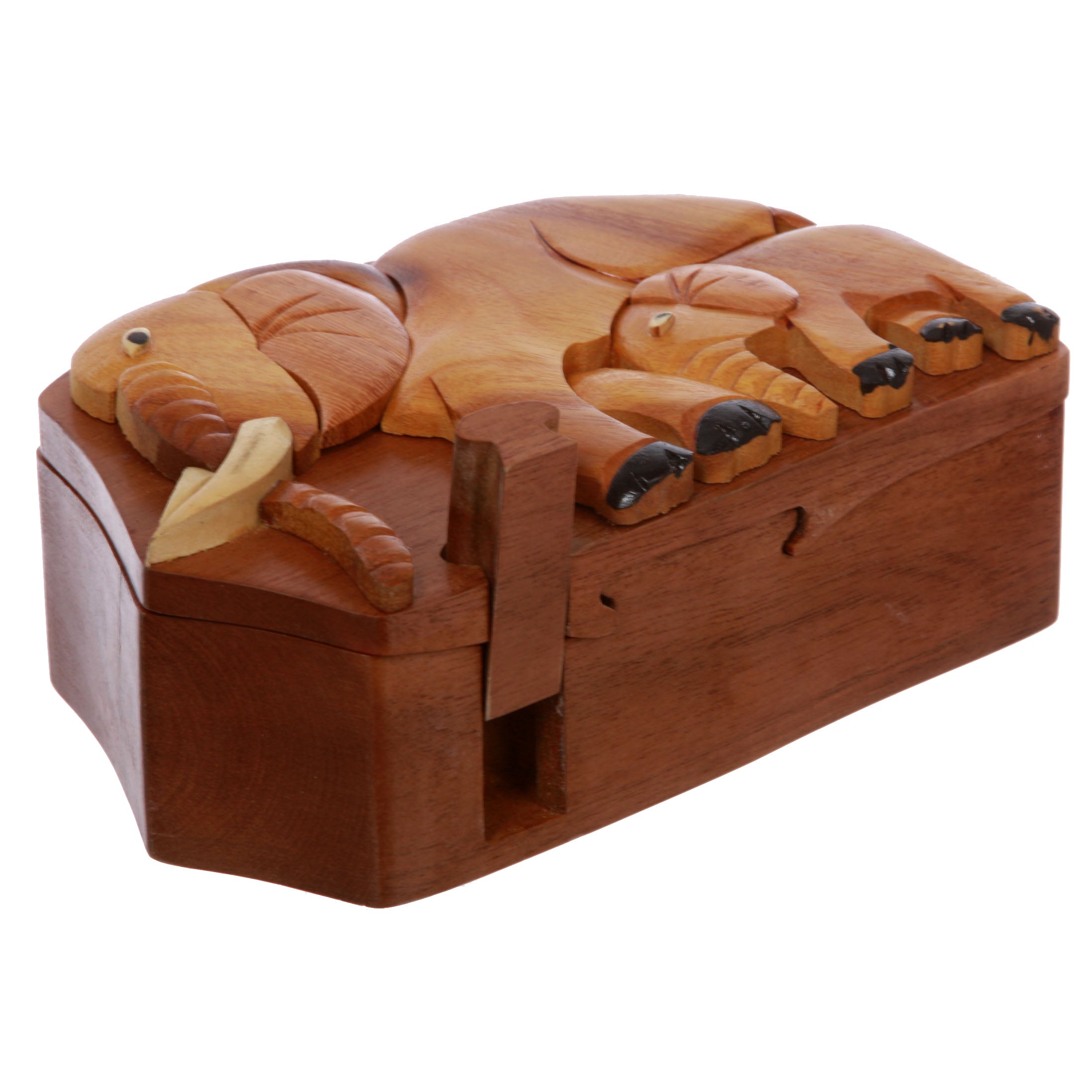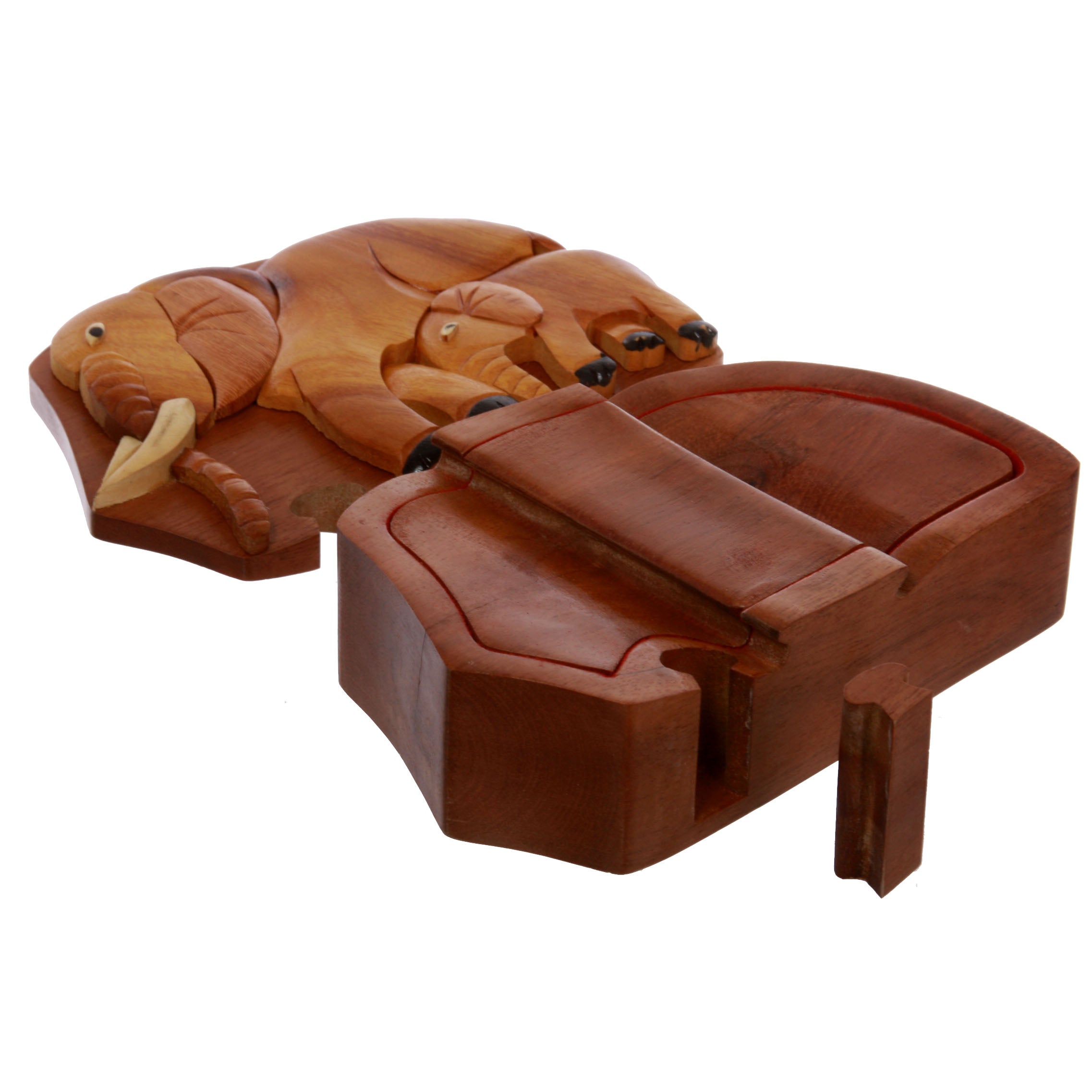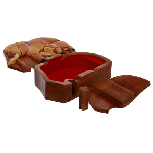 This Elephant shaped Secret jewelry box can only be opened if you know the secret. Perfect gift for that special someone. Beautifully Hand Made Wooden Box with Hand-carved embossed Elephant on the lid. It has a secret locking device, although the big secret opening isn't all that difficult to figure out. It is brand new. Each individual box is unique, they may look different from each other since every part of the box is made of unique wood material; Every piece comes in the original manufacturer's packaging. The photos here show an example of the item for sale. The coloring, grain and stripes might be different piece to piece, due to their uniqueness; Exterior Dimension (L X W X D): 6"(15 cm) X 4"(10 cm) X 5"(13 cm); Interior Dimension (L X W X D): 4"(10 cm) X 3-1/2"(8 cm) X 3/4"(2 cm); It is simple, well made, and useful for jewelry, money, or anything small in size you want storage for. You will get a lot of compliments on it