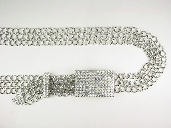 *This metal chain belt features clear rhinestone rectangular buckle with three row tiny metal oval chain belt. *Rhinestone rectangular buckle, keeper and tip. *Finish: nickel plated - shining silver color *Measurement: width of chain: 1", buckle dimension: 2 1/4"X 1 1/2" *Full Length:41", fits waist measurement of about 30"~38"