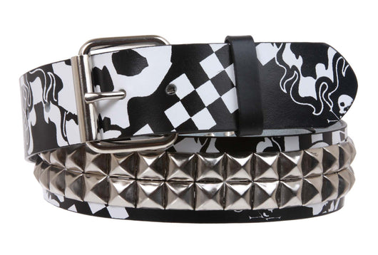 Snap On Art work Skull Cross Bone Tattoo Print Punk Rock Silver Star Studded Leather Belt