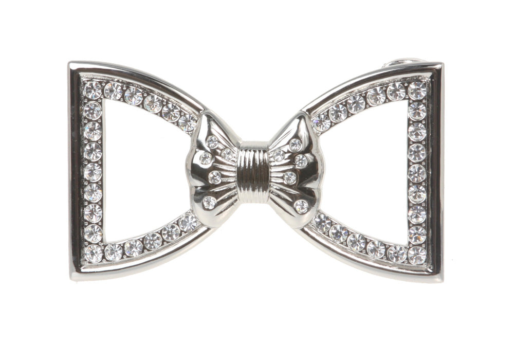 *Fashion Bow Tie Rhinestone Belt Buckle *Material: Zinc alloy metal *Dimension (Length X Width): 4" X 2 1/4" *Fits Belt of Width: 1 7/8" *This belt buckle works with belt strap with snap-on feature
