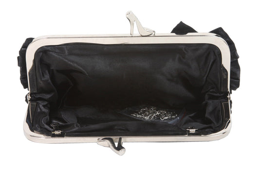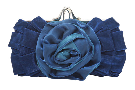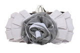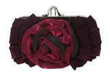 *This gathered and rose trim evening bag features sexy shoe clip hardware metal frame, with metal chain strap included *Lined interior *Dimension: 9"W x 6"H