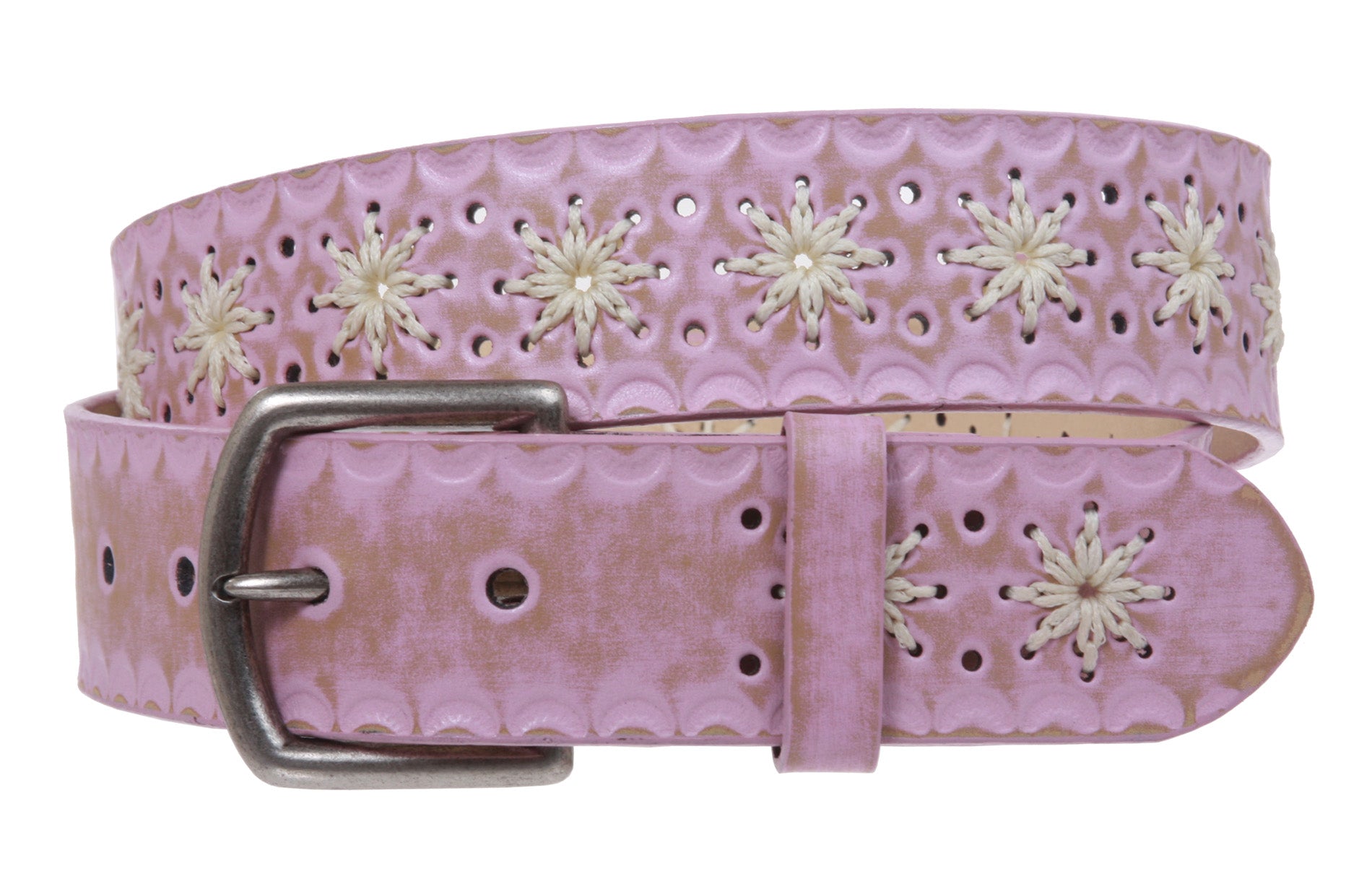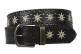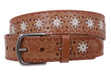 *This vintage looking leather belt features embossed flower with cut-out pattern down the strap and one row of PP rope woven sun flower pattern along the center.The brass color buckle is removable with snap on feature which allows you to switch most buckles. *Material: Genuine Bonded Leather *Width: 1 1/2" *Size Chart: |Size: S/M - 32" (to center hole);|End-to-end: 38" |Size: M/L - 36" (to center hole);|End-to-end: 42" |Size: L/XL - 40" (to center hole);|End-to-end: 46" Notes: the size chart does not include buckle length. There are total of five holes, 1" apart. It is recommended to select size from buckle fold to center hole that better matches measurement of your waist or where you wear this belt. It would be more comfortable to select a size that is about 1" or 2" bigger than the actual measurement of your waist.