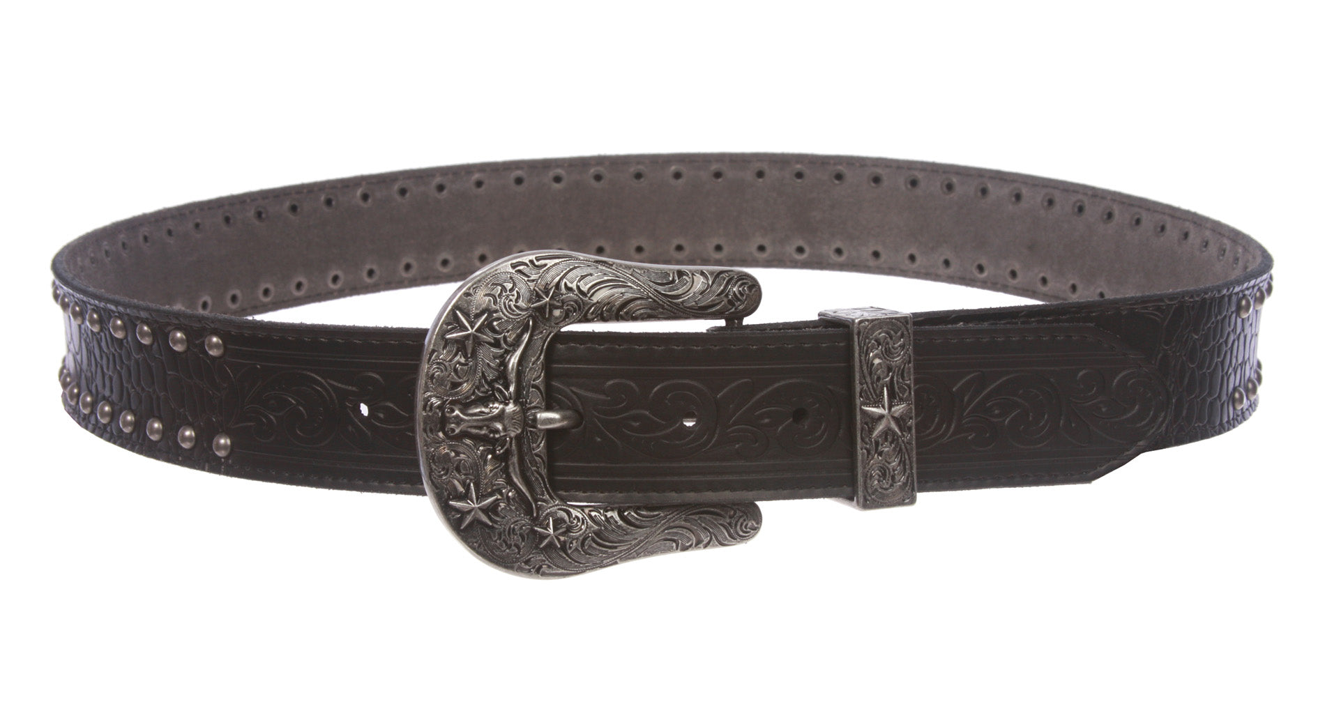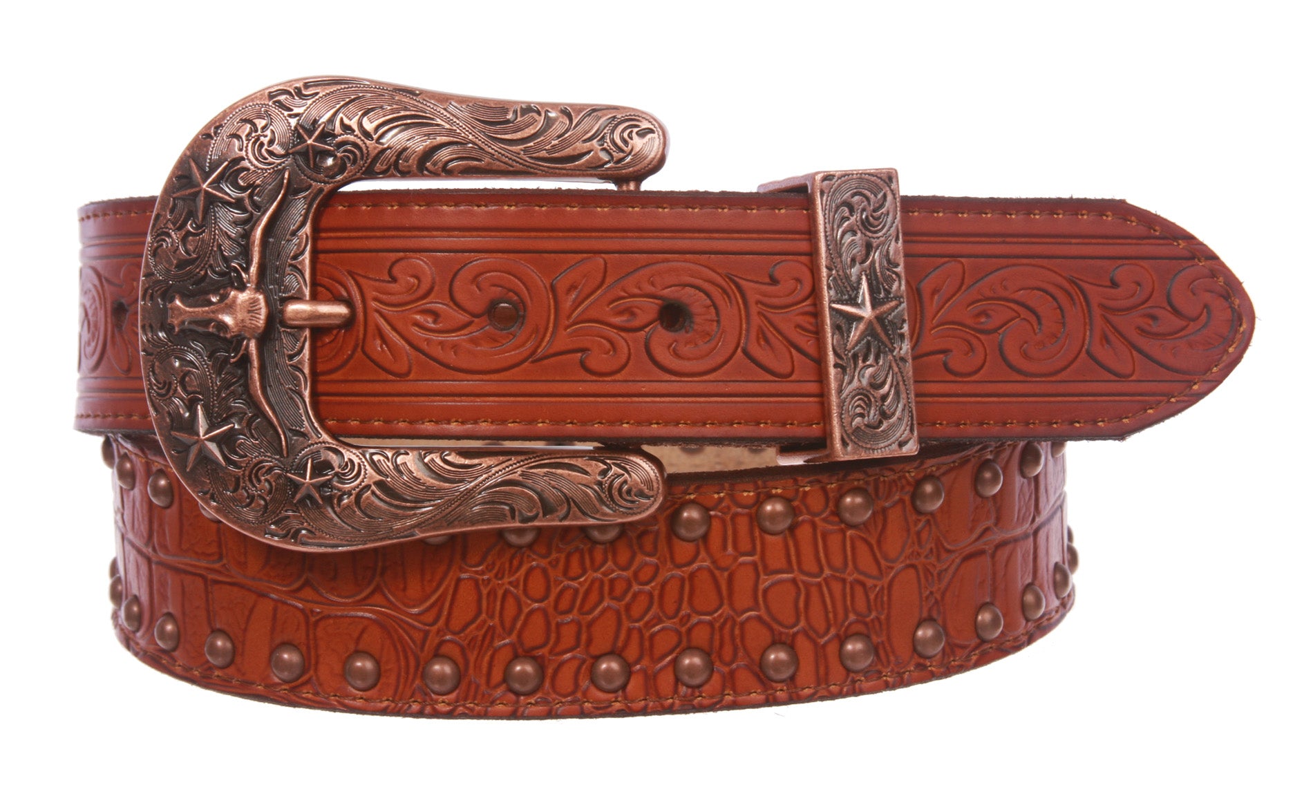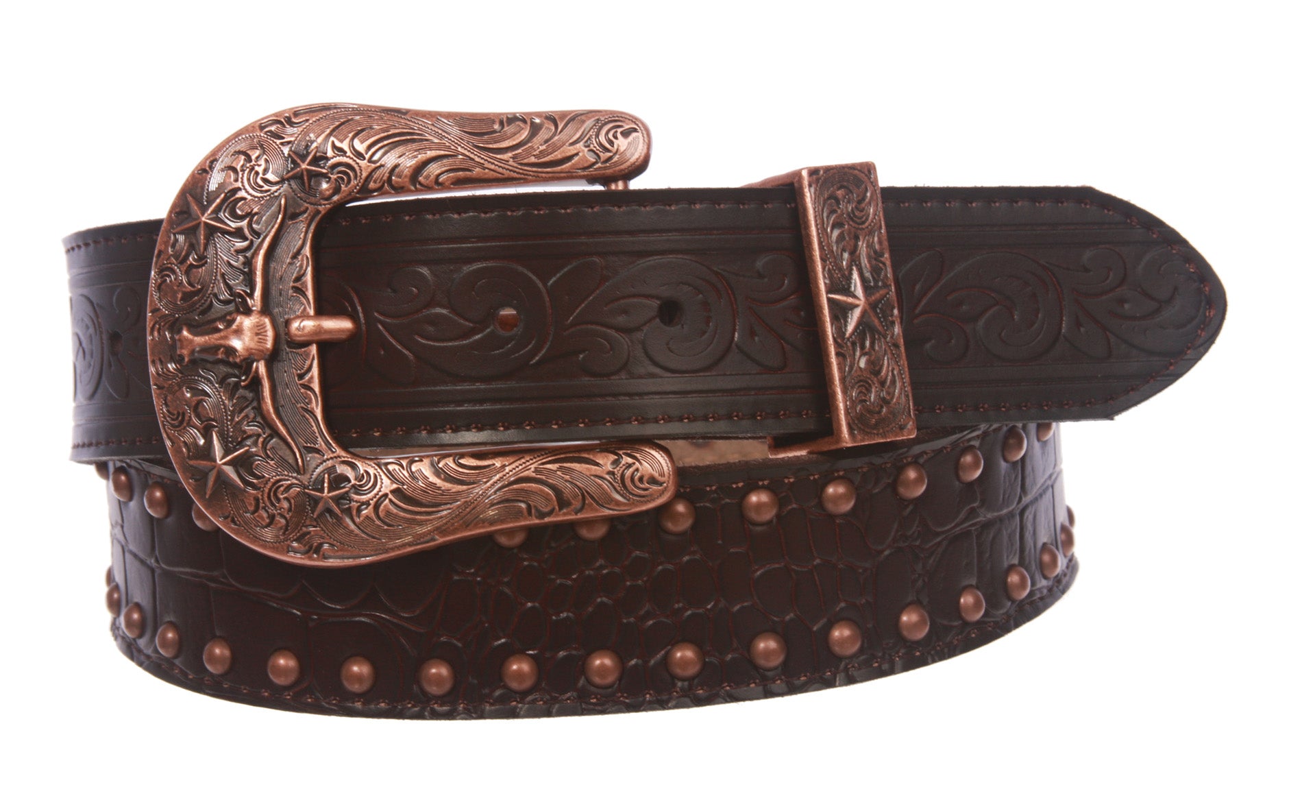Snap On Western Crocodile Print Stitching-Edged Studded Leather Belt