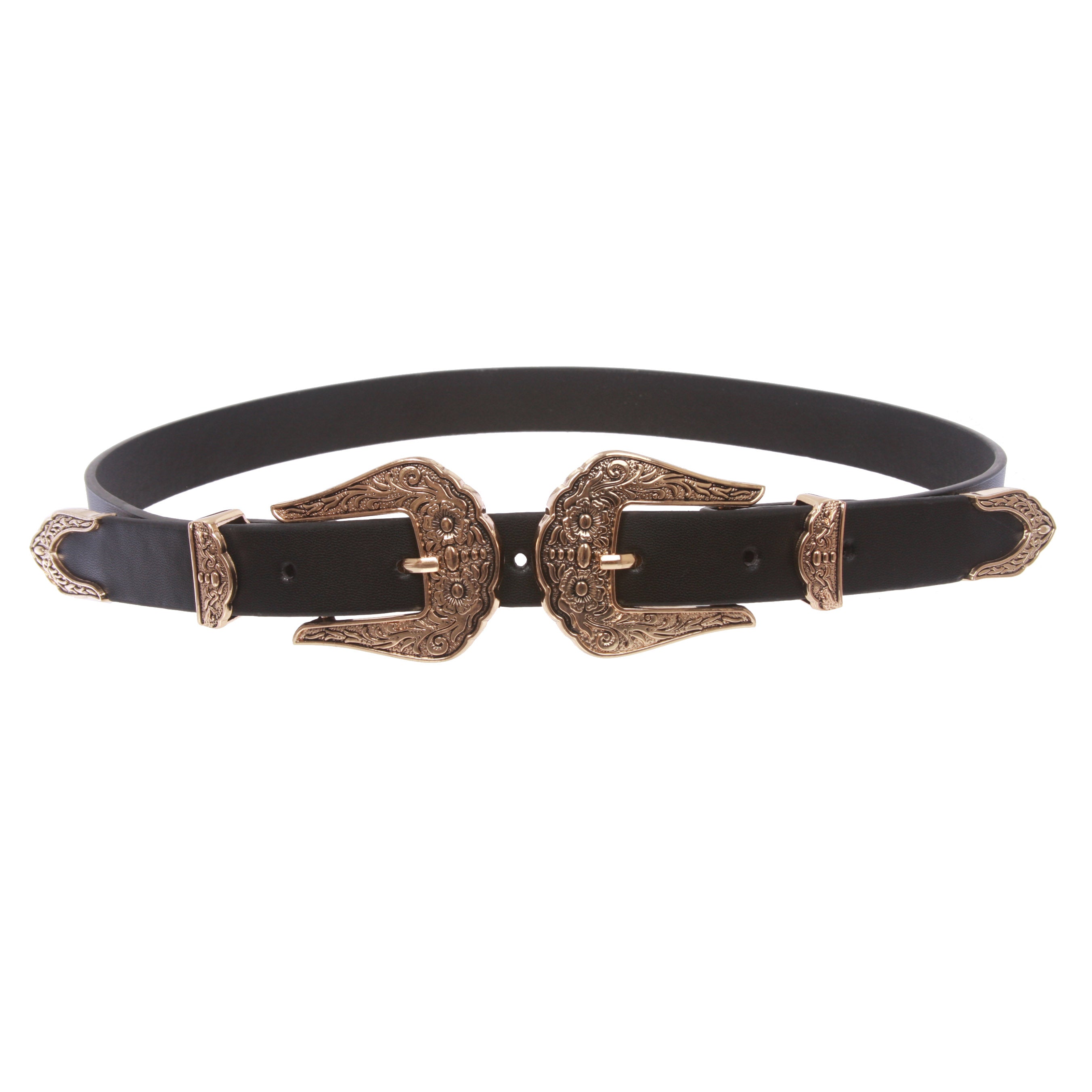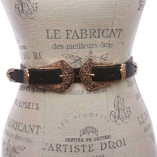 Women's Fashion Retro Carved Double Buckle Western Skinny Leather Belt