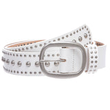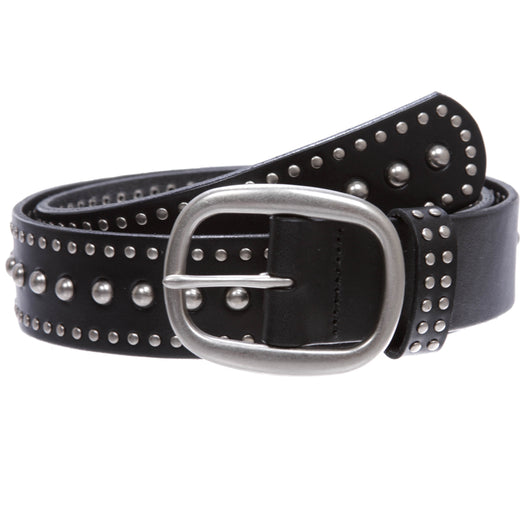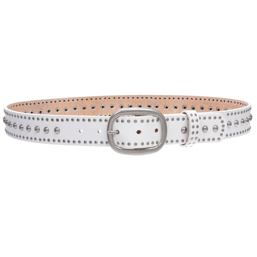 - This belt features three rows of metal circle studs down the strap with graceful oval shape metal buckle and studded keeper, for casual wear or with jeans
