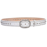 - This belt features three rows of metal circle studs down the strap with graceful oval shape metal buckle and studded keeper;