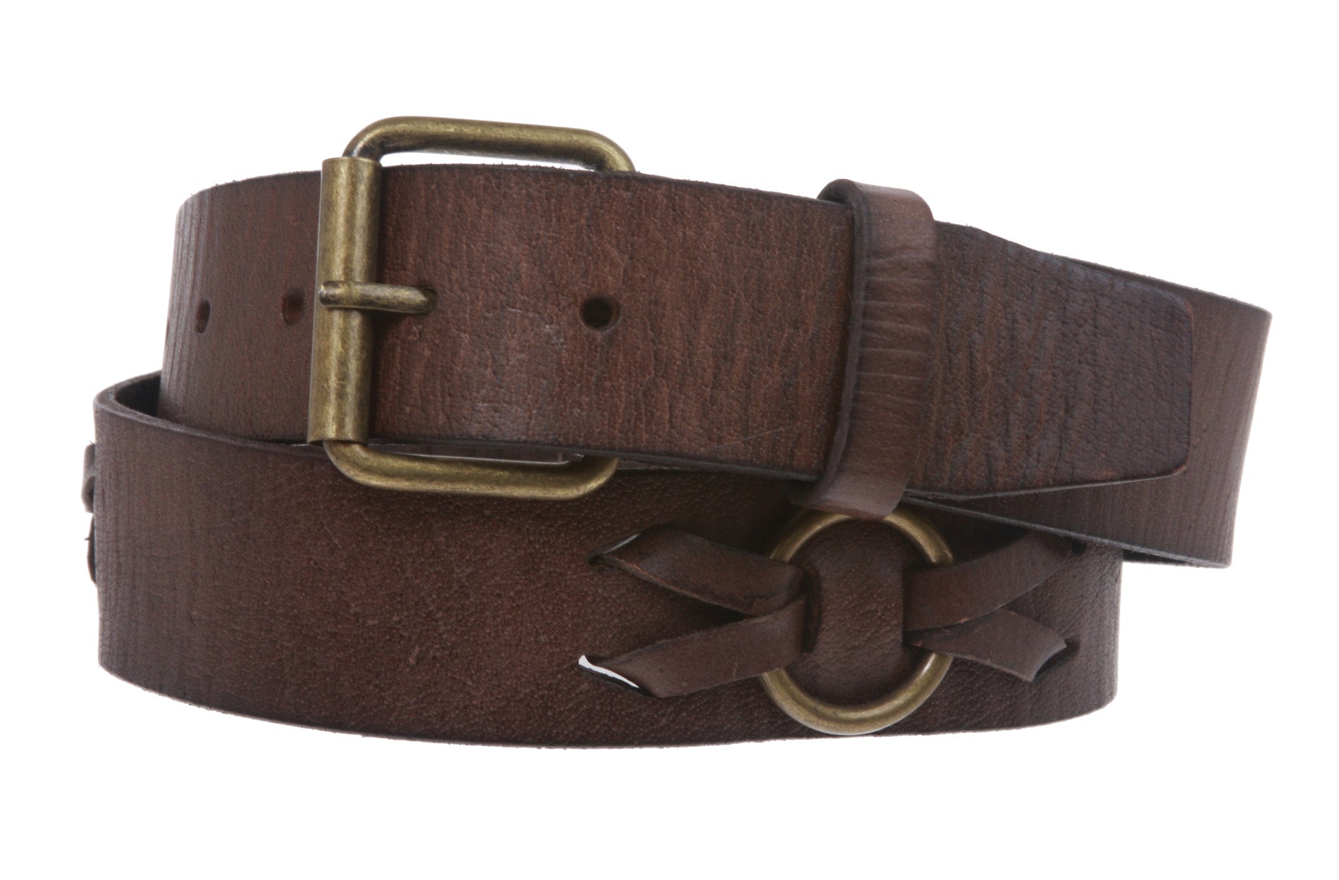 *This oil tanned genuine leather belt, with 4 sets metal circle ring decoration down the strap, features distressed looking, soft hand feeling, features snap on roller buckle, removable, perfect for belt buckle switch. *Material: 100 solid leather *Width of belt: 1 1/2 inches (38 mm), fits most of your favorite fashion buckles *Size chart: |Small - 32" (from buckle prong to center hole)|End to end: 38" |Medium - 36" (from buckle prong to center hole)|End to end: 42" |Large - 39" (from buckle prong to center hole)|End to end: 45" |Extra Large - 42" (from buckle prong to center hole)|End to end: 48"
