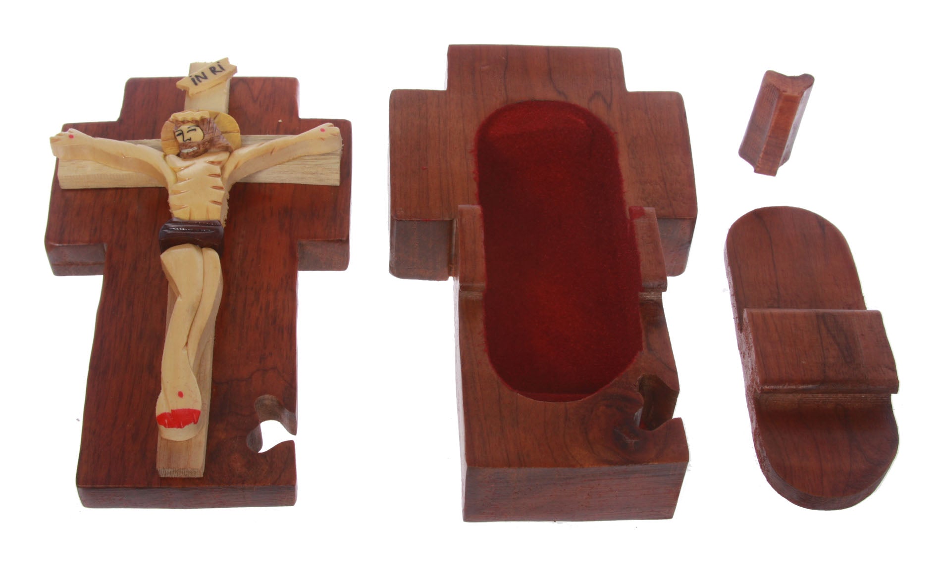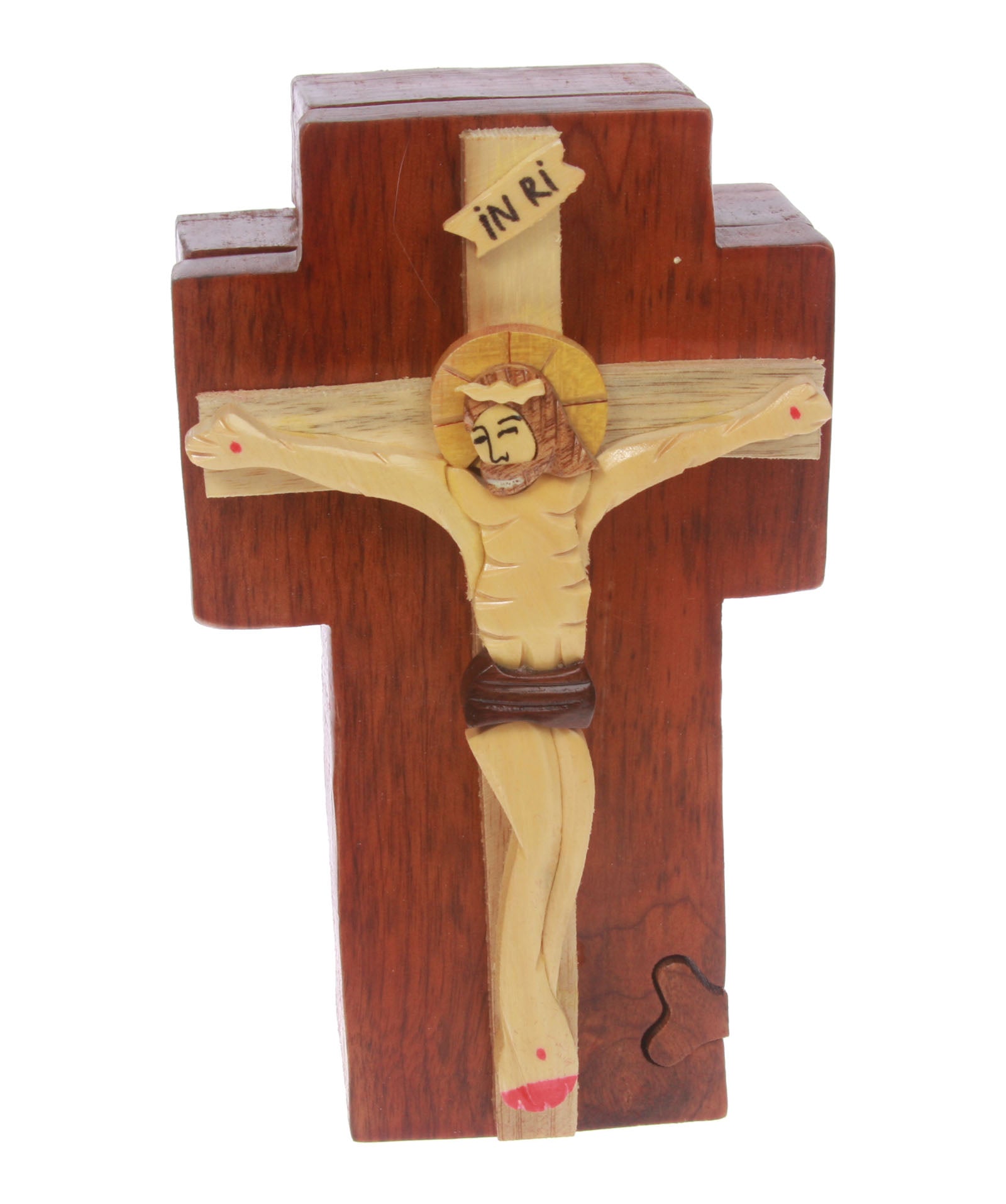 - Beautifully Hand Made Wooden Box with Hand-carved embossed Handcrafted Wooden Jesus on a Cross Secret Jewelry Puzzle Box -Jesus on a Cross on the lid. It has a secret locking device, although the big secret opening isn't all that difficult to figure out.