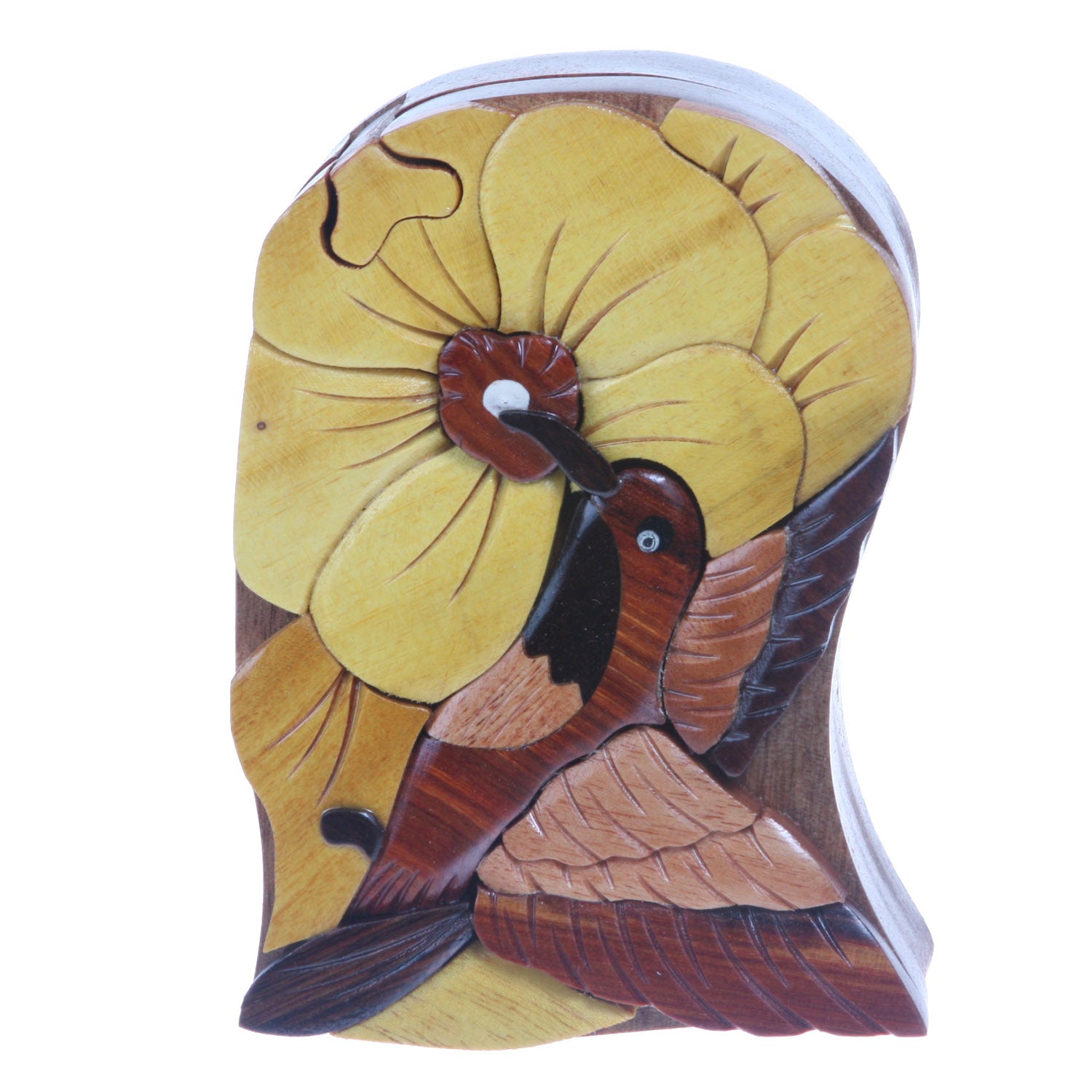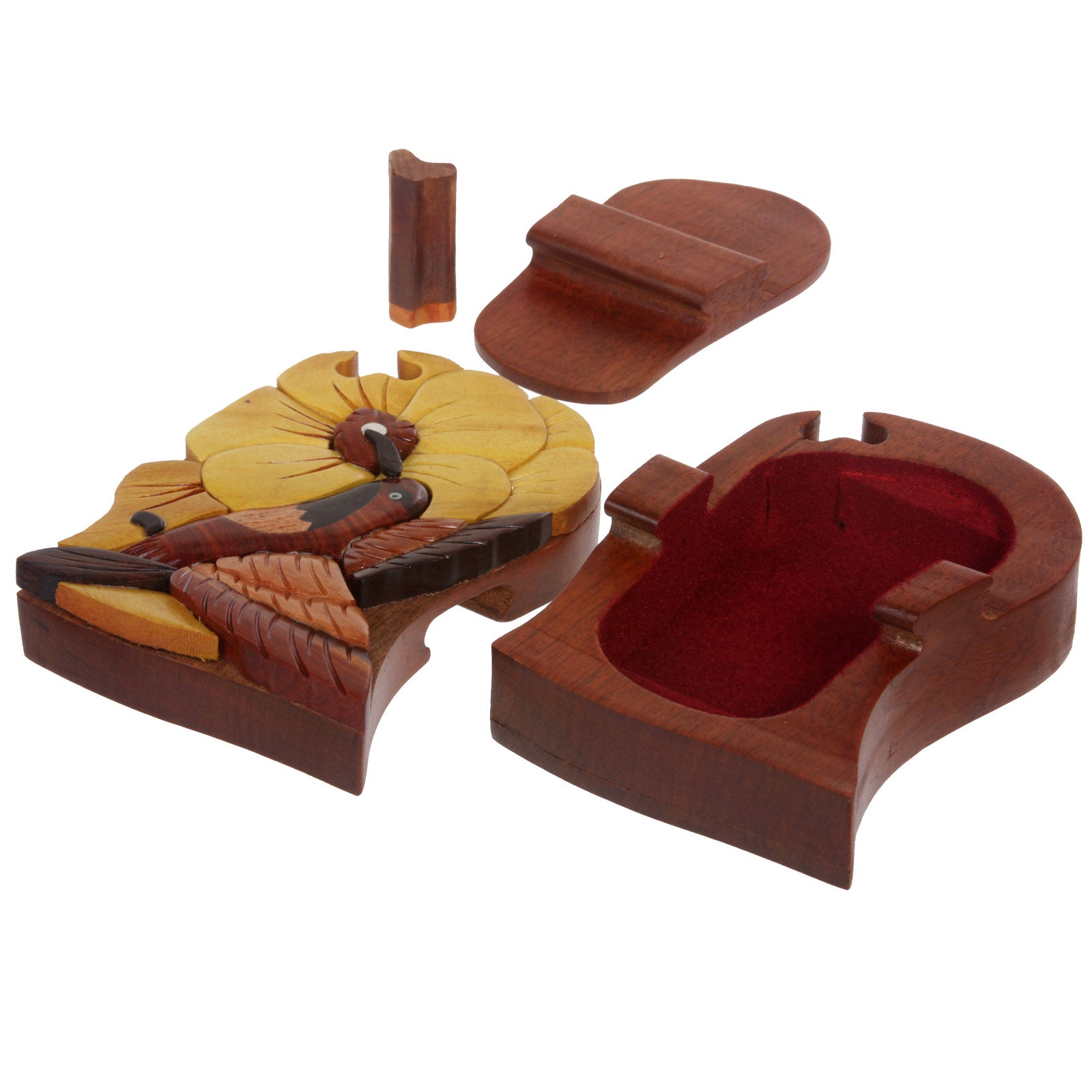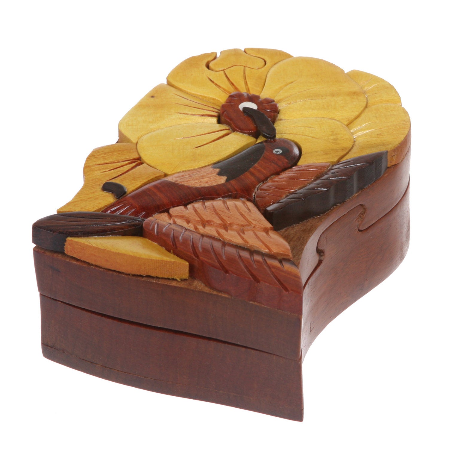 Handcrafted Wooden Bird & Flower Secret Jewelry Puzzle Box